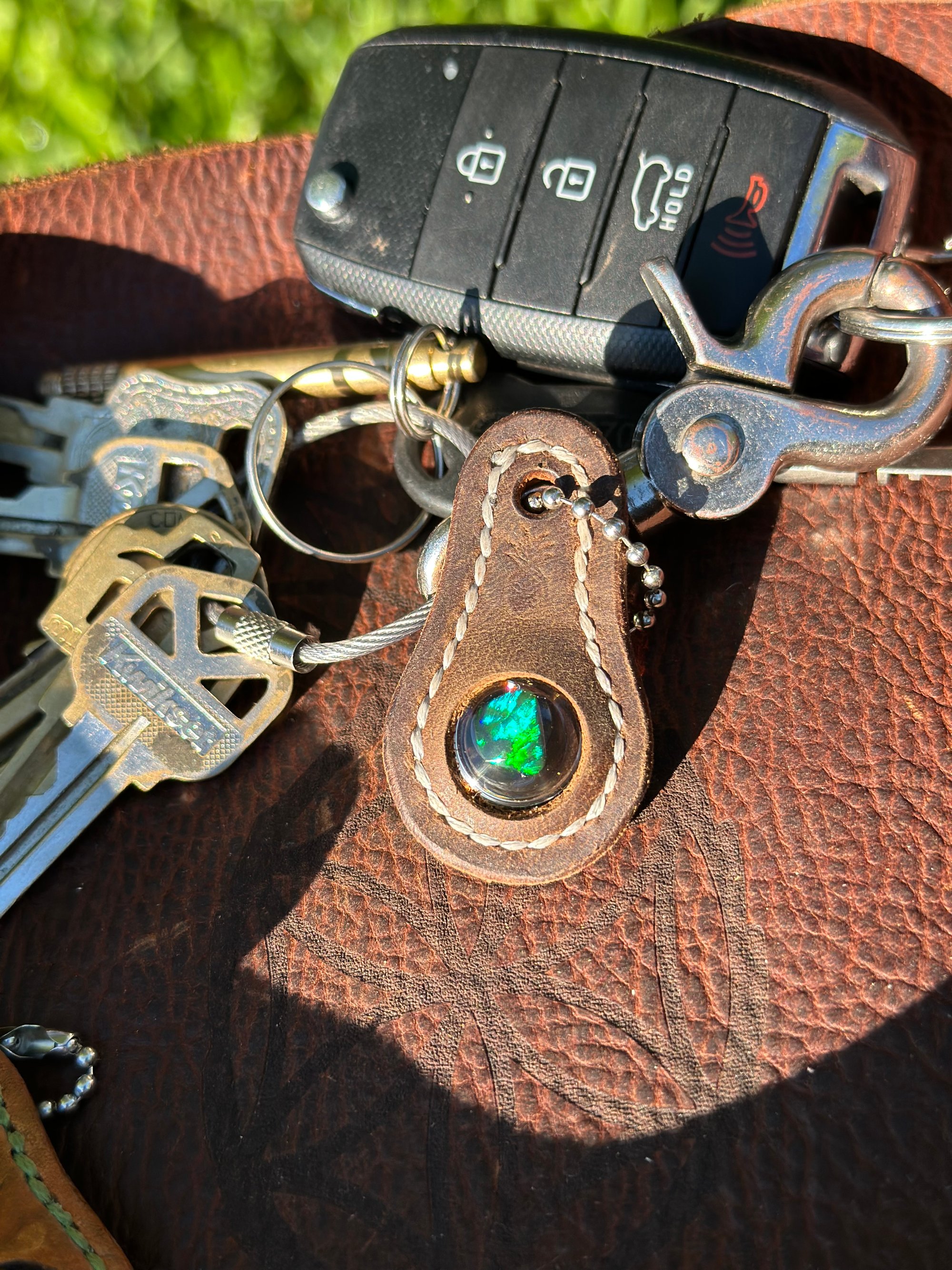 Leather keychain with opals. Chrom tan lather and hand stitched with black emerald opal. Comes with chain. Approx: 1.6”-1”-.5”